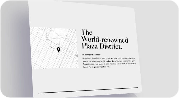 th Uncover a New Era of Midtown Mastery 712 5 Avenue, New York, NY 10019 The e v 5th A Central Park World-renowned W 56th St Plaza District. An Incomparable Address e v Manhattan’s Plaza District is not only home to the city’s most iconic buildings, 5th A it’s also the largest commercial, media and entertainment center on the globe. Steeped in history and worldwide fame, everything from its shops on 5th Avenue to Central Park is quintessential New York.