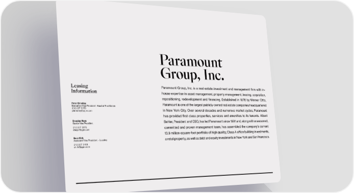 th Uncover a New Era of Midtown Mastery 712 5 Avenue, New York, NY 10019 Paramount Group, Inc. Leasing Paramount Group, Inc. is a real estate investment and management 昀椀rm with in- Information house expertise in asset management, property management, leasing, acquisition, repositioning, redevelopment and 昀椀nancing. Established in 1978 by Werner Otto, Peter Brindley Paramount is one of the largest publicly-owned real estate companies headquartered Executive Vice President, Head of Real Estate 212 237 3156 [email protected] in New York City. Over several decades and numerous market cycles, Paramount has provided 昀椀rst class properties, services and amenities to its tenants. Albert Douglas Neye Behler, President and CEO, has led Paramount since 1991 and, along with a seasoned, Senior Vice President 212 237 2976 committed and proven management team, has assembled the company’s current [email protected] 13.9 million-square-foot portfolio of high quality, Class A o昀케ce building investments, Sean Kirk Assistant Vice President – Leasing a retail property, as well as debt and equity investments in New York and San Francisco. 212 237 3168 [email protected]
