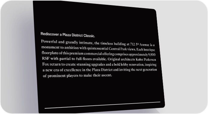 th Uncover a New Era of Midtown Mastery 712 5 Avenue, New York, NY 10019 Rediscover a Plaza District Classic. th Powerful and grandly intimate, the timeless building at 712 5 Avenue is a monument to ambition with quintessential Central Park views. Each boutique 昀氀oorplate of this premium commercial o昀昀ering comprises approximately 9,800 RSF with partial to full 昀氀oors available. Original architects Kohn Pedersen Fox return to create stunning upgrades and a bold lobby renovation, inspiring a new era of excellence in the Plaza District and inviting the next generation of prominent players to make their ascent.